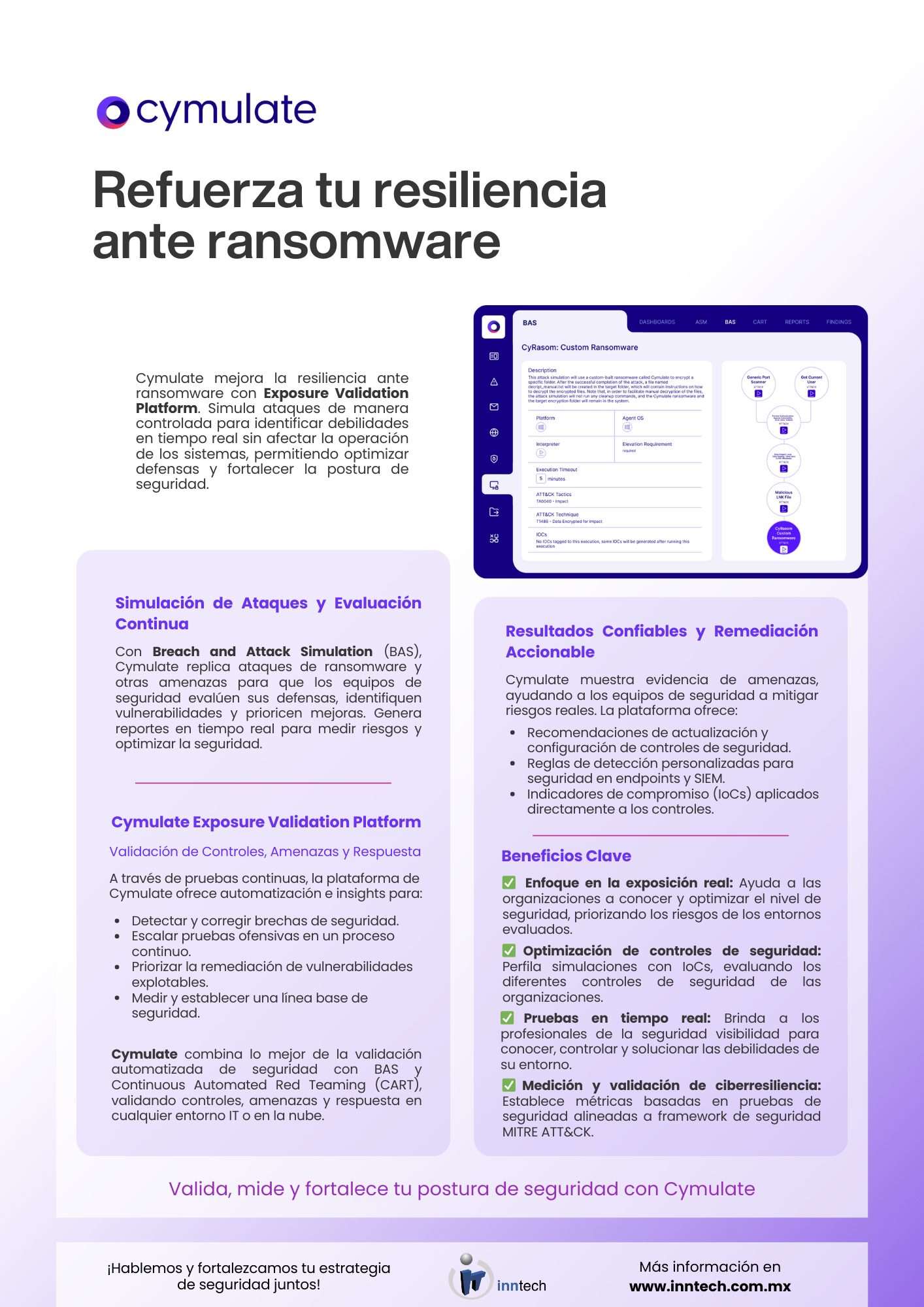 Cymulate mejora la resiliencia ante ransomware con Exposure Validation Platform. Simula ataques de manera controlada para identificar debilidades en tiempo real sin afectar la operación de los sistemas, permitiendo optimizar defensas y fortalecer la postura de seguridad.